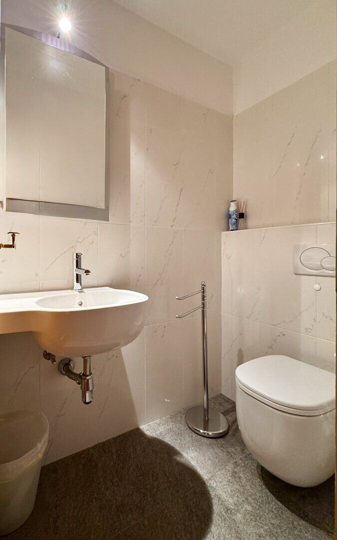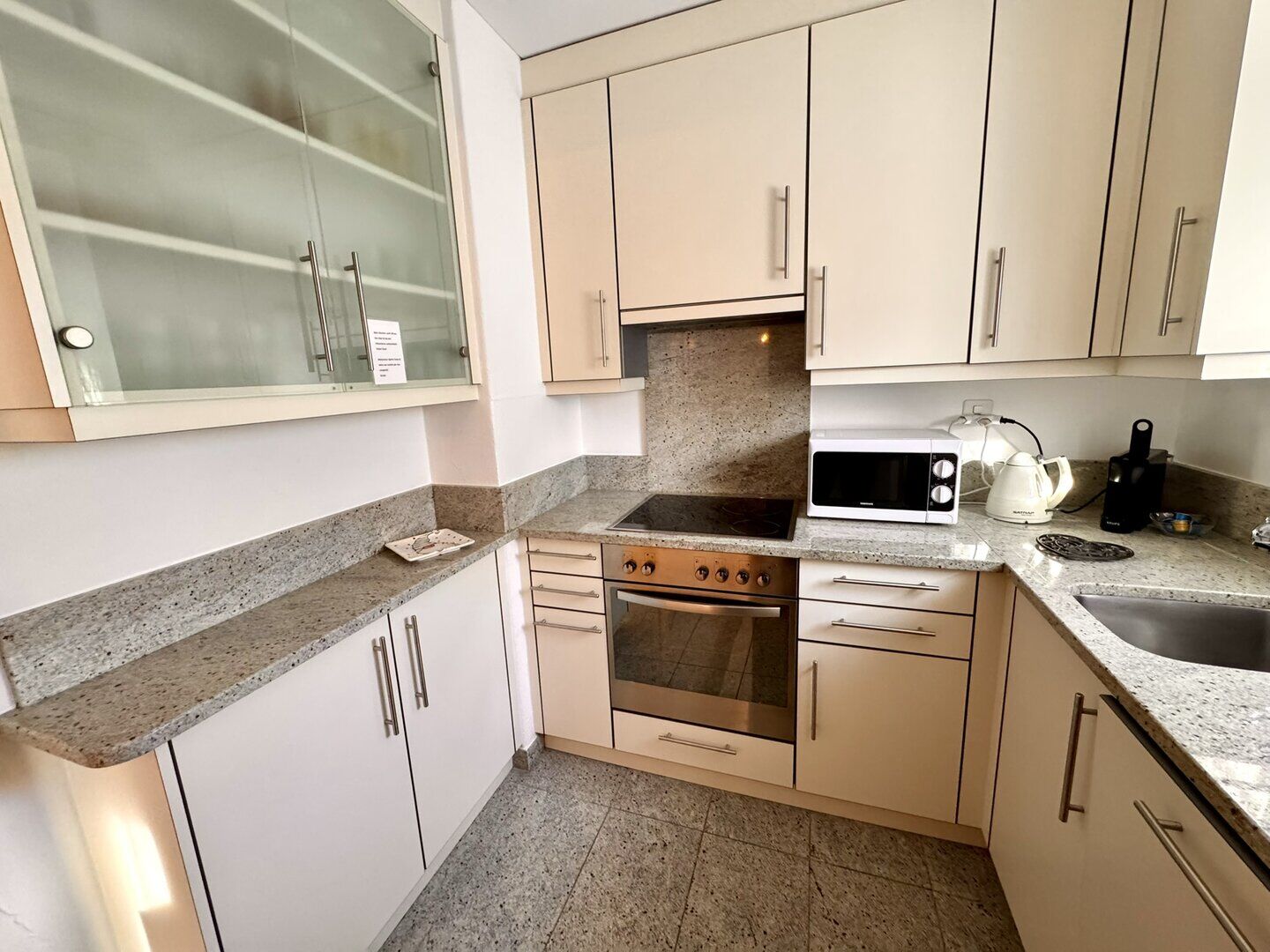 Das große Wohn- und Esszimmer lädt mit einem direkten Zugang zum Balkon ein. Die gut ausgestattete Küche ist praktisch gestaltet und bietet alles, was Sie für die Zubereitung köstlicher Mahlzeiten benötigen. Zudem befindet sich die Ferienwohnung nahe zum Einkaufszentrum, sodass Sie schnell alle wichtigen Besorgungen erledigen können. Das Badezimmer verfügt über eine Dusche und WC, zusätzlich gibt es ein separates WC, was den Komfort der Wohnung erhöht.