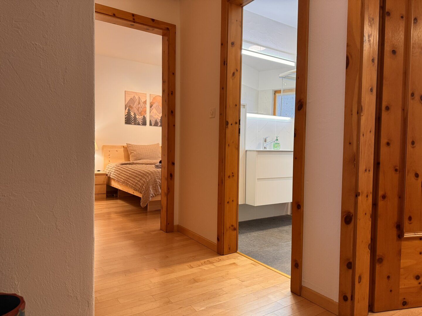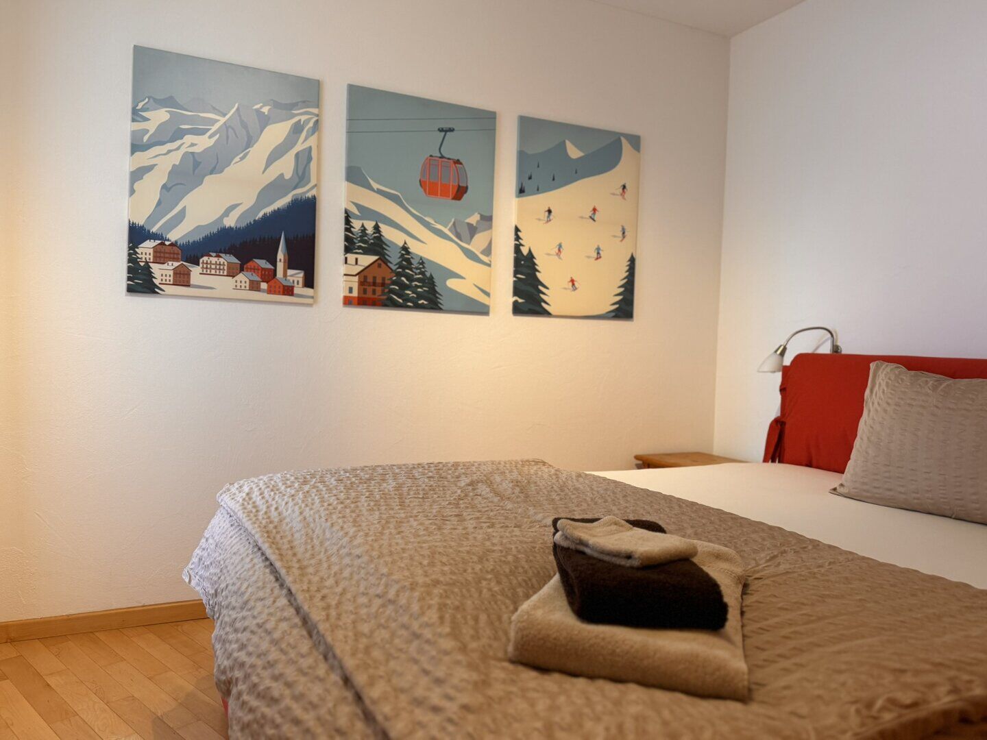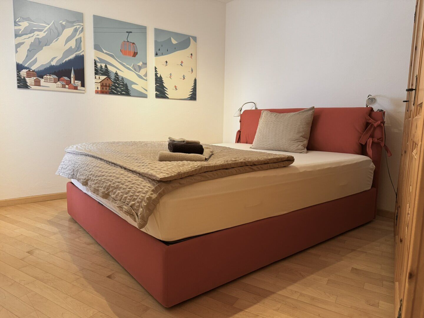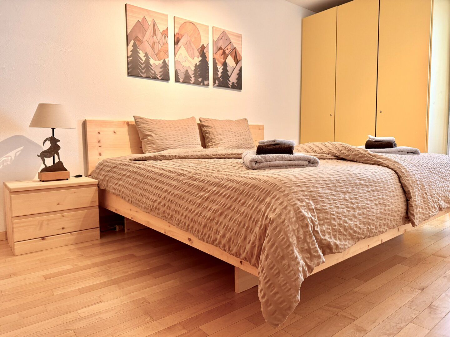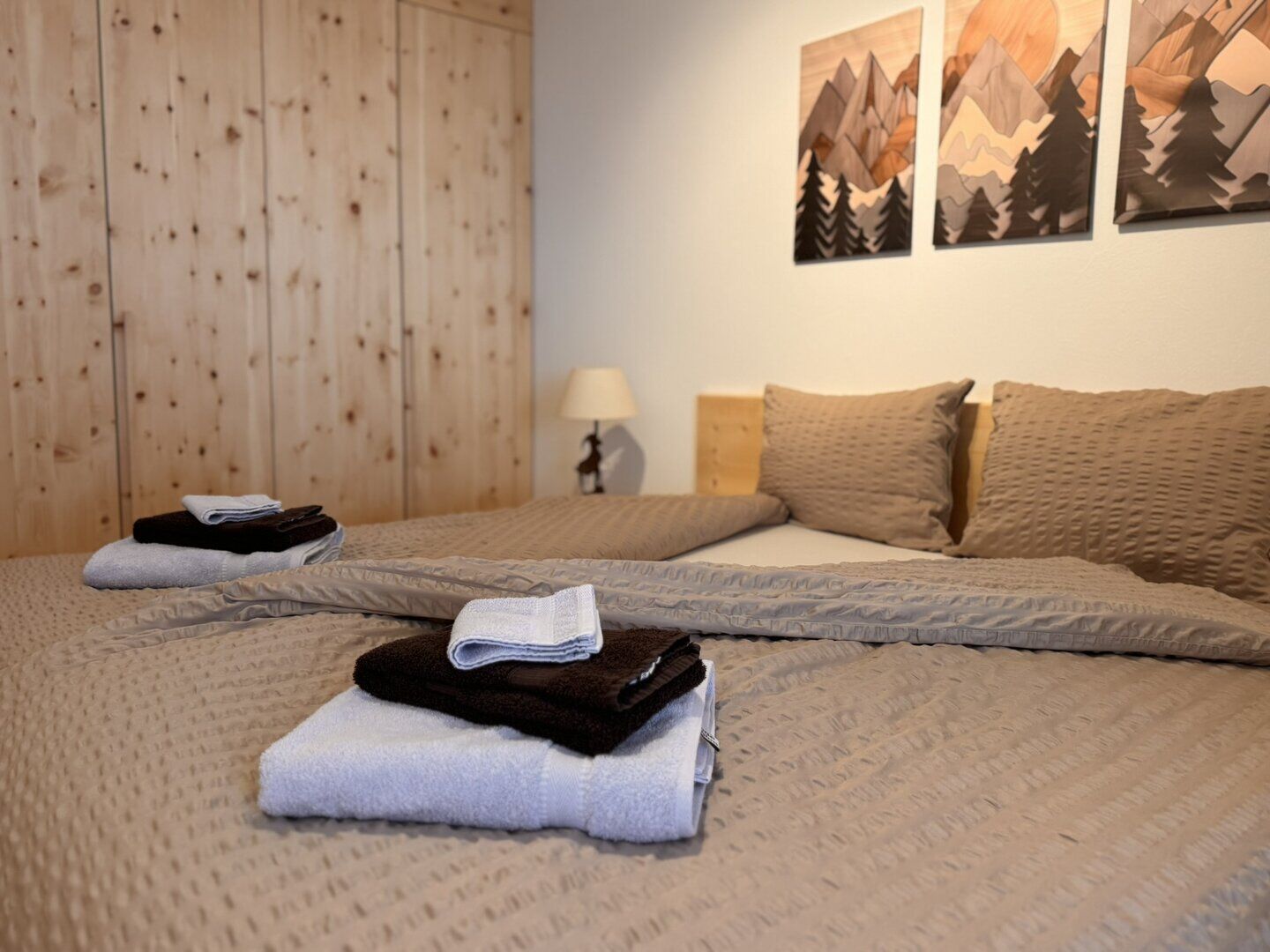 Die Schlafzimmer sind mit je einem gemütlichen Doppelbett eingerichtet. Beide Schlafzimmer bieten viel Platz, und das zweite Schlafzimmer hat zudem einen eigenen Balkon mit Blick auf den Piz Padella – perfekt für ruhige Momente und um die alpine Atmosphäre zu genießen.