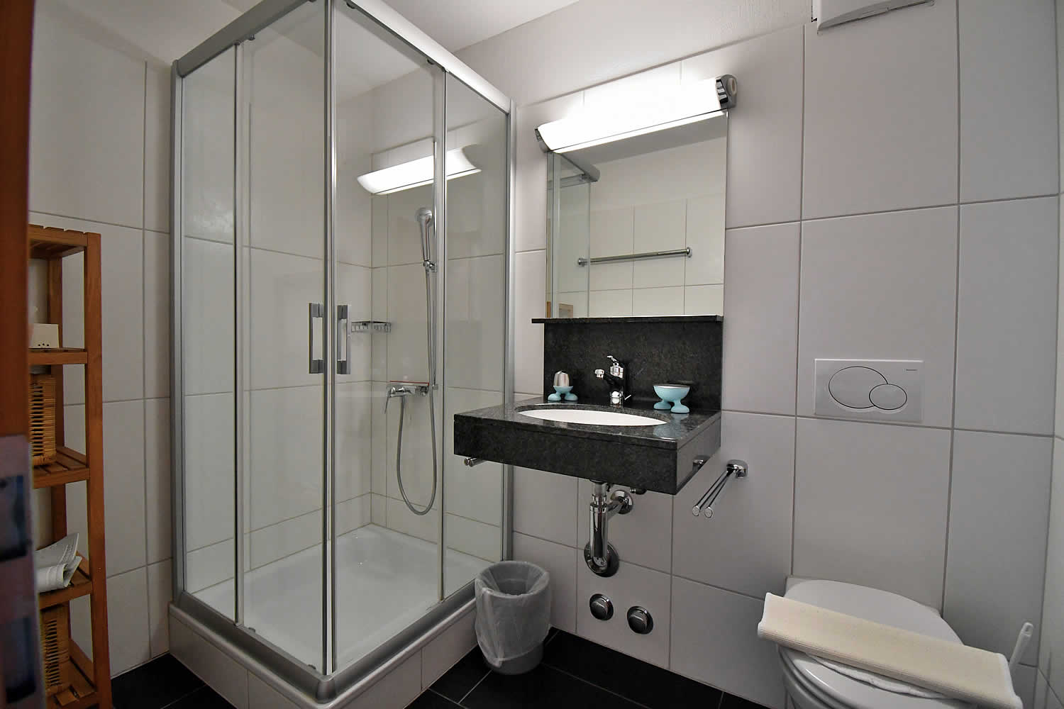 Die Wohnung verfügt über ein weiteres Badezimmer mit Dusche und WC, sodass auch bei mehreren Gästen ausreichend Komfort gewährleistet ist. Ein besonderes Highlight ist die große Terrasse, die sich über die gesamte Länge der Wohnung erstreckt und mit einem Esstisch sowie Liegestühlen ausgestattet ist. Hier können Sie die Sonne genießen und dank der freien Panoramasicht die beeindruckende Umgebung auf sich wirken lassen – eine perfekte Ferienwohnung mit großer Terrasse für entspannte Stunden im Freien.
