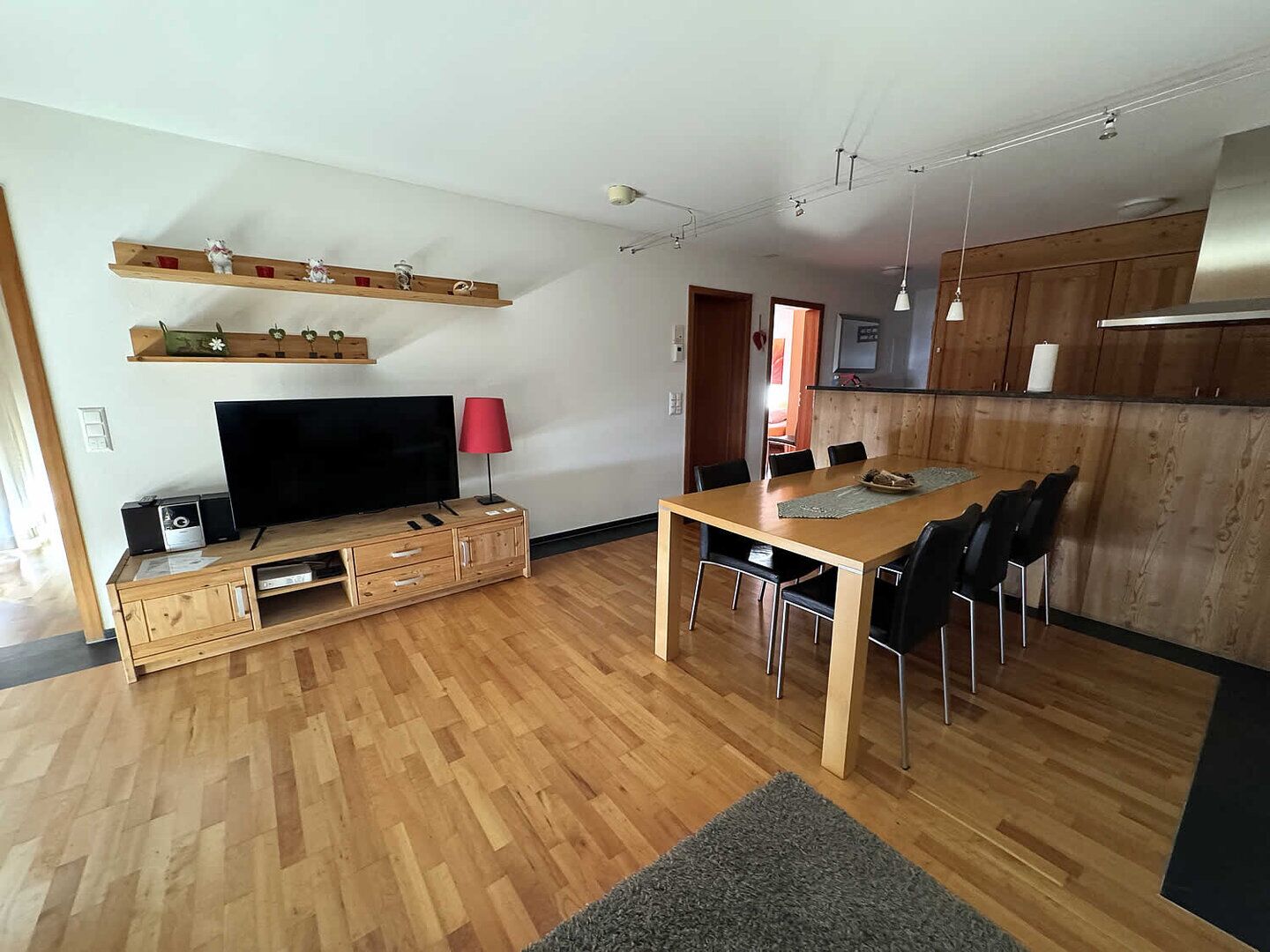 Der einladende Eingangsbereich führt in das geräumige Wohn- und Esszimmer, das nahtlos in eine moderne, offene Küche übergeht. Hier finden Sie alles, was Sie für gemütliche Mahlzeiten oder gesellige Abende benötigen. Das Wohnzimmer ist zudem mit einem 50" TV mit TV Plus Abo ausgestattet, damit Sie auch in den Ferien Unterhaltung auf höchstem Niveau genießen können.